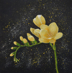 2020Gecombineerd met twee schilderijtjes uit dezelfde serie - paarse en rode fresia's - vormt het een blikvanger aan de muur. Als je twee werken uit de serie koopt dan krijg je 10% korting. Koop je er drie, dan krijg je 15% korting.